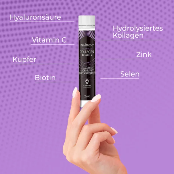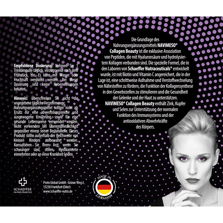 Our Navimeso Beauty Collages contain the finest, selected ingredients, manufactured in Germany according to the strictest quality standards. No additivesonly pure, effective ingredients that promote your beauty.